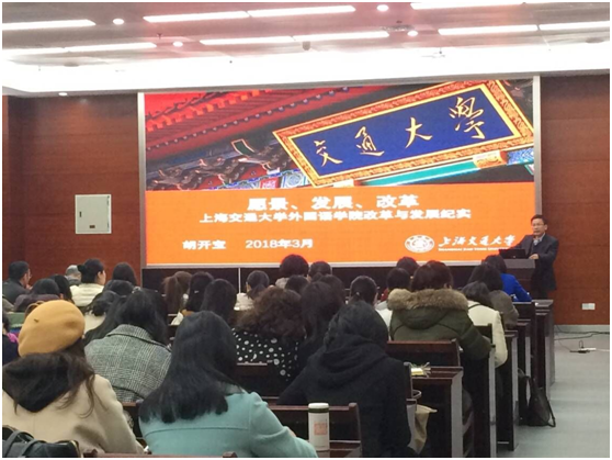 本次报告会的主题为“愿景、发展、改革”,胡开宝教授介绍了上海交通大学外国公司的改革发展举措;提出了明确目标、聚焦改革,引育并举、激发活力,注重内涵、定位精英,学科交叉、对接前沿,瞄准一流、追踪国际的办学方针;分析了要实现学科内涵式发展,推进世界一流大学及团队建设,需要充分调研,制定针对措施,明确改革目标,激发教师活力,实施综合改革,建立以制度激励为核心的管理体制。他提出,要依据团队建设目标引进人才,注重人才引进与团队建设相结合,重视学科梯队建设及学科可持续发展;要积极推进人才培养及科研工作改革,实现学科交叉,对接世界前沿,并充分发挥外语学科优势,广泛开展社会服务;还要与国际一流高校接轨,提升国际化办学水平,建设国际化学科平台,加强人才培养国际合作。