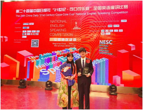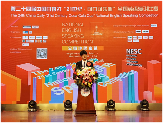 由中国日报社、可口可乐大中华区联合主办的第二十四届中国日报社“21世纪·可口可乐杯”全国英语演讲比赛安徽赛区决赛于2018年11月10日在安徽工业大学圆满结束。来自m88英语专业2016级刘子源和胡近涵两名选手经过校级初赛选拔,脱颖而出,最终代表m88官网参加省赛,并分别取得亚军和二等奖的佳绩。亚军获得者刘子源同学将代表安徽省参加明年三月的国赛。