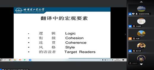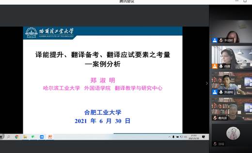 2021年6月30日19:00时,哈尔滨工业大学m88翻译教学与研究中心主任郑淑明副教授以线上腾讯会议方式为公司师生开展了一场题为“译能提升、翻译备考、翻译应试要素之考量——案例分析”的讲座。讲座由中心主任肖薇副教授主持,中心成员、翻译课程教师、MTI研究生、英语专业部分本科生及导师参加了本次讲座。