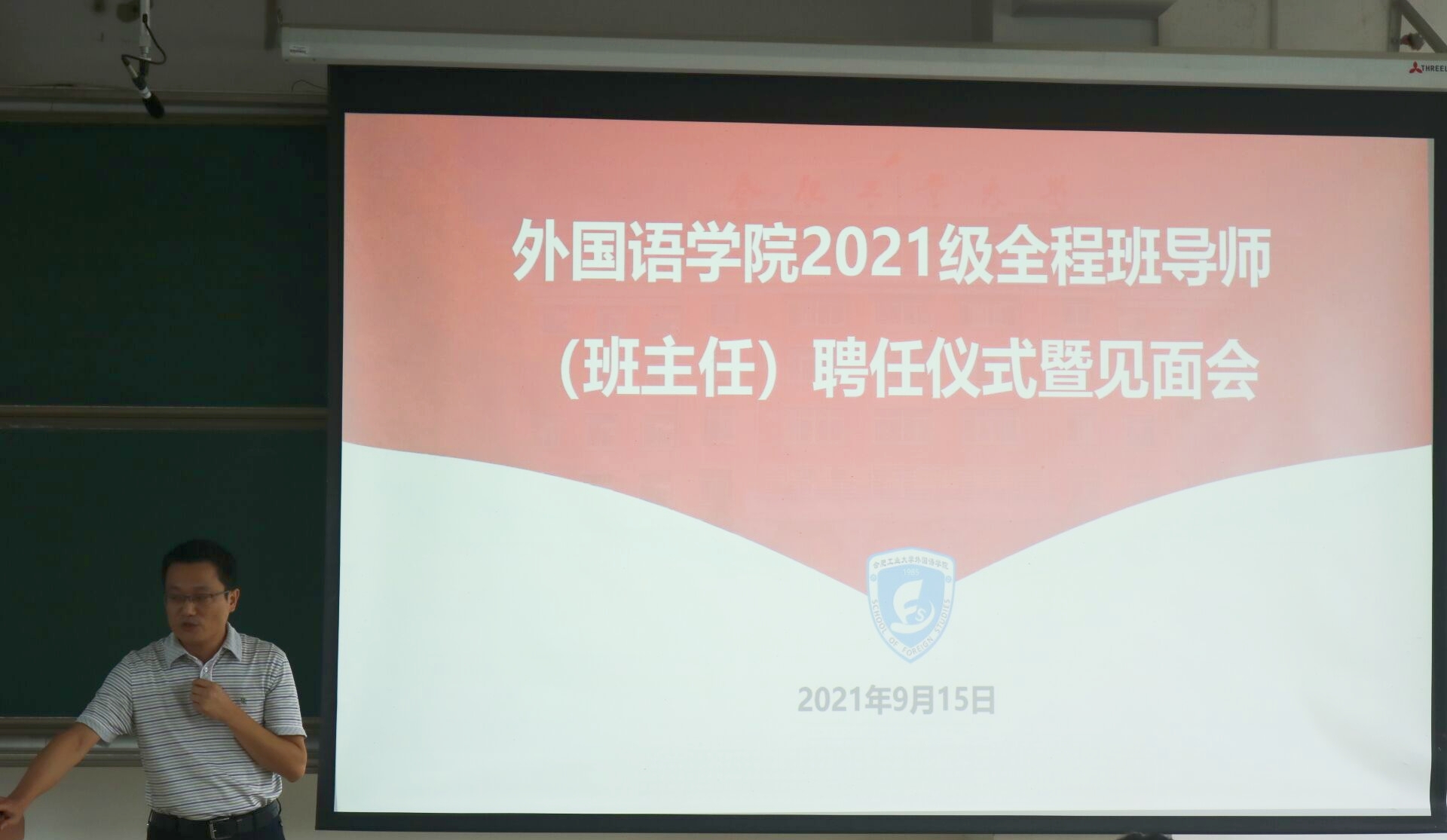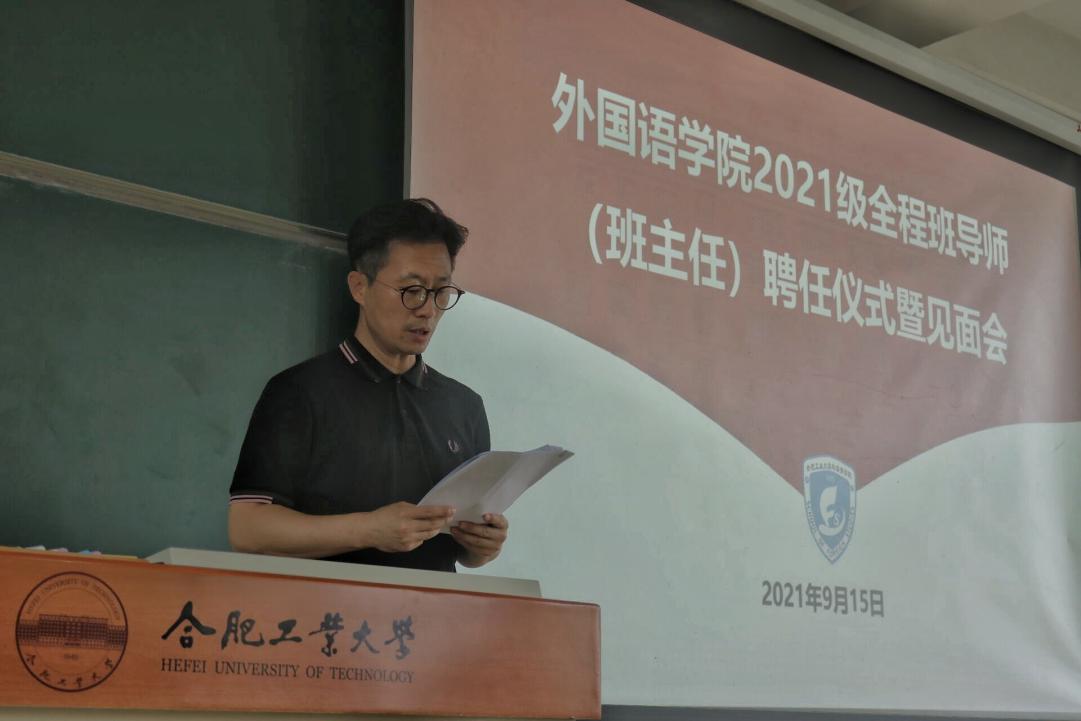 苏光靖宣读关于印发《m88全程班主任(班导师)试点工作实施细则》的通知,以及2021级新聘班主任、班导师名单。