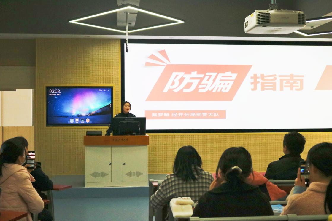 为进一步提高老员工网络诈骗的防范意识,营造防范电信网络诈骗的良好氛围,切实维护校园的安全稳定,12月1日下午,m88特邀合肥市公安局经开分局民警戴梦晗于翠4教209教室开展“紧绷防范之弦,远离诈骗之害”防电信诈骗专题讲座,公司党委副书记兼纪委书记苏光靖出席本次报告会,m88各年级员工到场听取报告。