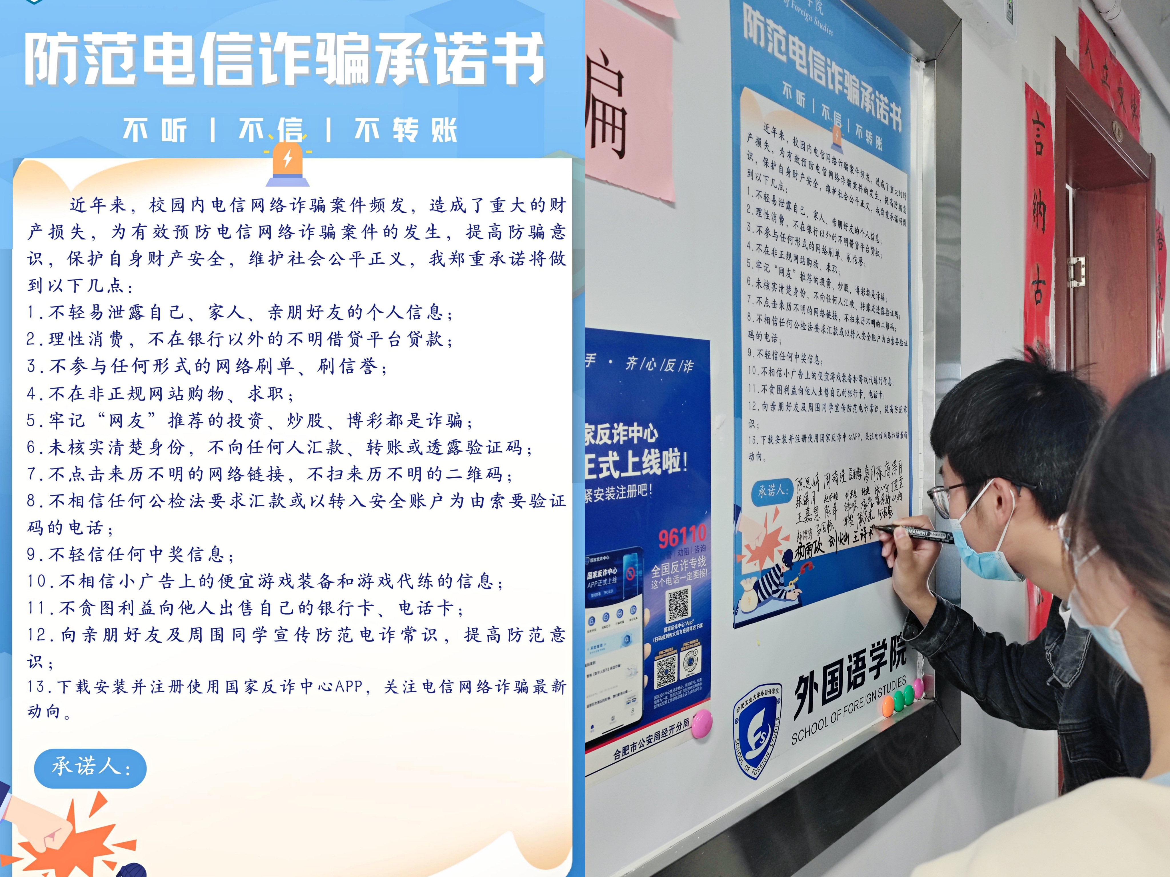 确保线下宣传“百分百”。充分利用网格化管理,多渠道、多方式走进员工宿舍开展防诈骗宣传,张贴防诈骗小贴士,签署《m88防范电信诈骗承诺书》,做到100%下载安装、100%实名上线、100%操作使用国家反诈中心APP。