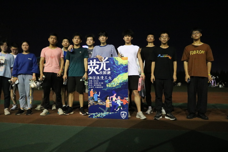 路线组夜跑是采用打卡方式,参加的同学们先于东风广场签到并领取相关物资,在领跑员的引导下,在校园内按照既定路线慢跑。本次路线跑设置有建艺馆前方草坪、图书馆后门空地、南门对面广场、教学楼十字路口、排球场前等五处“打卡点”,每到一处打卡点便能够收集相应的印章,最后去东风广场服务台换取精美的纪念品。夜色下、光影中,那五彩缤纷的荧光头饰和手环,点亮了夜晚的工大;那欢畅的笑声谱写出青春最动听的旋律。每一位参与者都在尽情享受着奔跑的快乐,他们用荧光点亮希望,用青春告白工大。