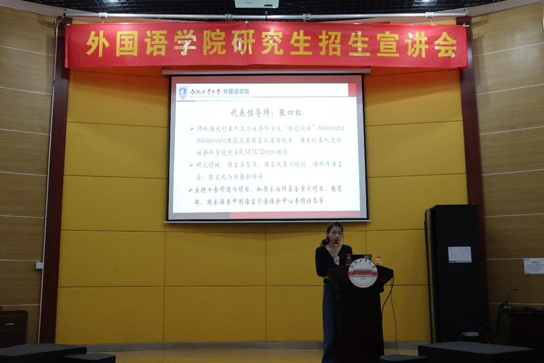 5月27日下午,公司2023年度研究生招生首场宣讲会在宣城校区老员工活动中心小报告厅举行。本次宣讲会由英语系陈路林主任主持,公司教学经理黄川带领研究生招生老师进行招生宣传。宣讲会上,徐鄢雯老师从学位点详情、团队队伍、教学平台与设施、导师科研成果简介、招生详情、就业与深造情况以及研究生学习生活等方面给在场的同学们进行了详细地讲解。