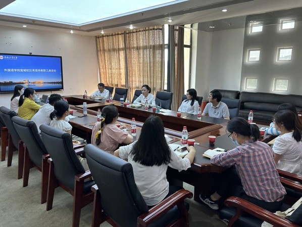 座谈会上,唐军一行详细了解了宣城校区英语系教师近三年的年均工作量,听取了员工实习及毕业论文、2023届毕业生保研、考研及出国情况等相关工作的汇报,与参加座谈的教师就教学、科研及生活中所遇到的困惑进行了交流,对宣城校区英语系团队不足、教师职称层次提升、教学研究与教学改革等教师们关心的问题进行了细心解答,并就宣城校区英语系新增办公室所需经费等事项进行了研讨。唐军充分肯定宣城校区英语系育人成果取得的成就,并就当天上午听课情况与教师们进行了交流,希望教师们加强个人职业发展规划,鼓励青年教师向优秀老教师学习,做好本职工作,推动全系教师和谐发展,教书育人取得更大的成就。