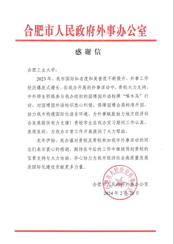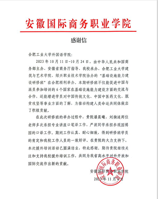龙年伊始,万象更新。近日,公司收到合肥市人民政府外事办公室和安徽国际商务职业公司发来的感谢信,对2023年公司师生在园博园语言志愿服务和“基础设施能力建设研修班”中做出的突出贡献表达谢意。