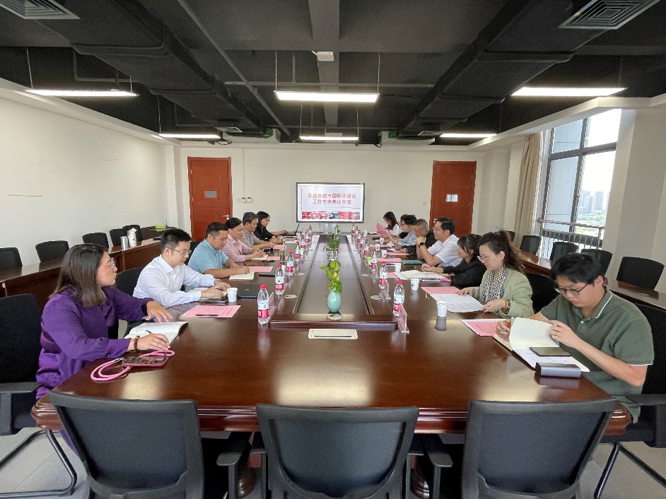 9月23日上午合肥市国际化建设工作专班调研交流会在科教楼A座1510顺利举行,市政府外事办公室主任刘鹏、礼宾处处长杜欢、国际化促进处副处长吴凡,市国际化建设工作专班执行副主任吴海军,高新区自贸局副局长李流芳等一行来公司交流,公司经理唐军,副经理黄川、肖薇、李康熙,国际交流中心主任华啸尘,员工工作办公室主任兼团委书记赵雰雰,党政办公室主任苏凌云参加了此次座谈。