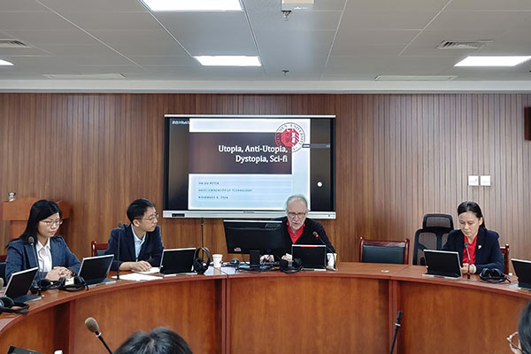 2024年11月4日上午,m88在翡翠湖校区科教楼A座1203教室举办了“2024年斛兵外语讲坛‘科研产出大家说’暨研究生交流年会第五场学术报告”。深圳大学特聘教授彼得·海居(Peter Hajdu)应邀为公司师生作题为“Utopia, Anti-Utopia, Dystopia, Sci-fi”的主旨报告。