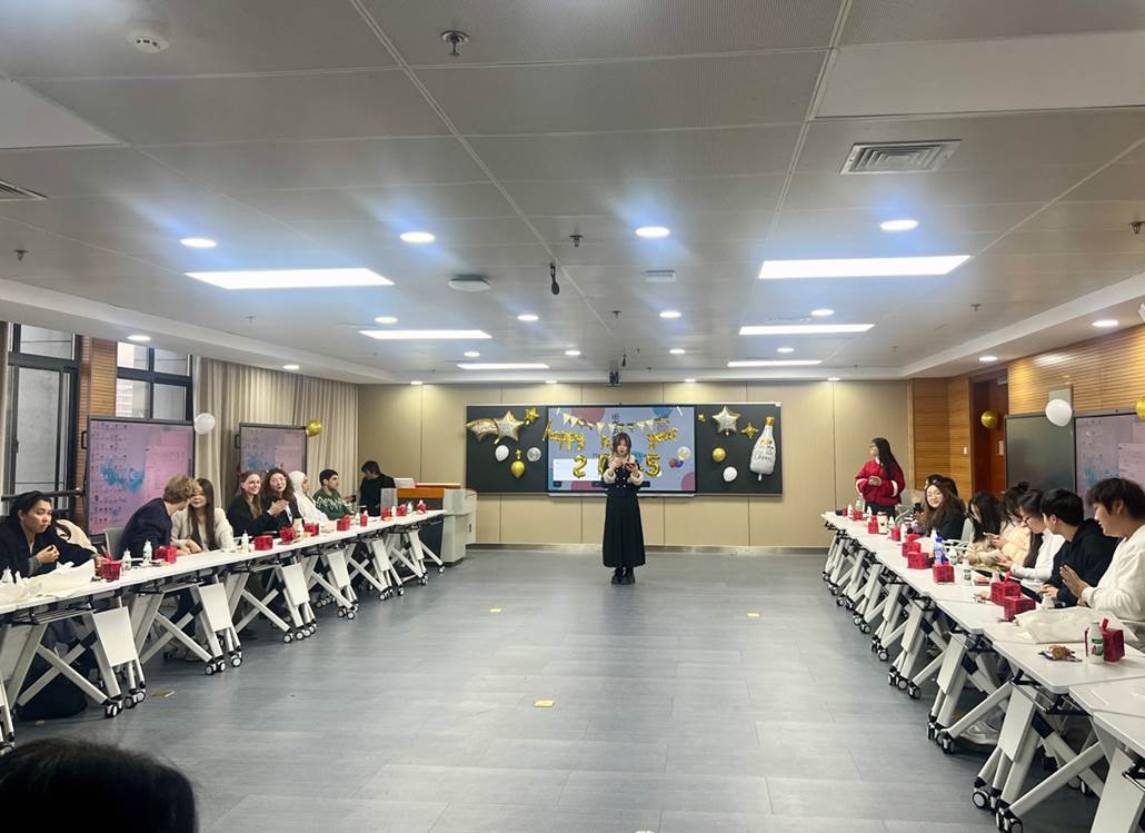 活动节目由24级的赵鸿叶等同学策划,秦豪和崔欣妍两位同学双语主持。李敏佳、Lukas等中外员工表演的各种中英文歌舞节目让大家流连忘返;热依拉·吾买尔江和杨雯冉组织的互动游戏让师生们开怀大笑,寓意美满的贺卡让彼此的情谊更加深厚。