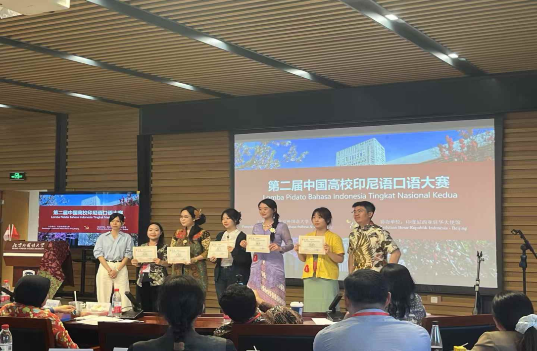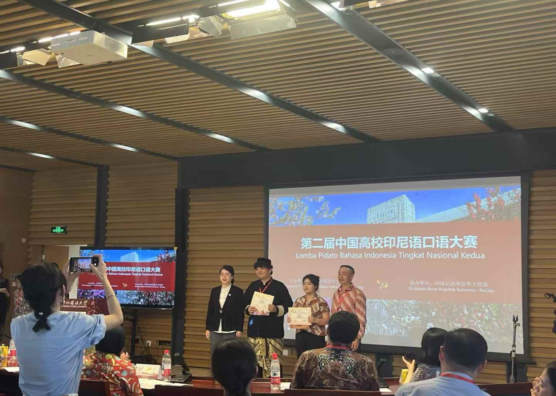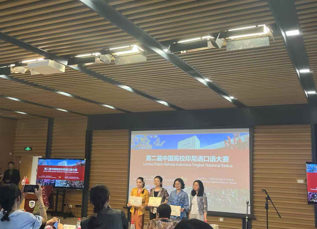2025年4月26至27日,由北京外国语大学主办及印度尼西亚(以下简称“印尼”)驻华大使馆协办的“纪念中国与印度尼西亚建交75周年暨第二届全国高校印尼语口语大赛”在北京圆满落幕。该赛项以“数智时代的印尼语学习”和“弘扬万隆精神,构建中印尼命运共同体”为主题,分为低年级组和高年级组两个赛道。此次比赛由印尼驻华大使馆公使衔参赞、教育参赞、一等秘书和主流媒体的国际传播专家等担任评委会成员,经过激烈的竞争,公司印尼语专业2023级学子陈红斩获低年级组最高奖一等奖,2022级学子周芋君和钱梦媛分别荣获高年级组二等奖、三等奖。